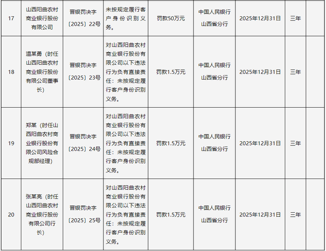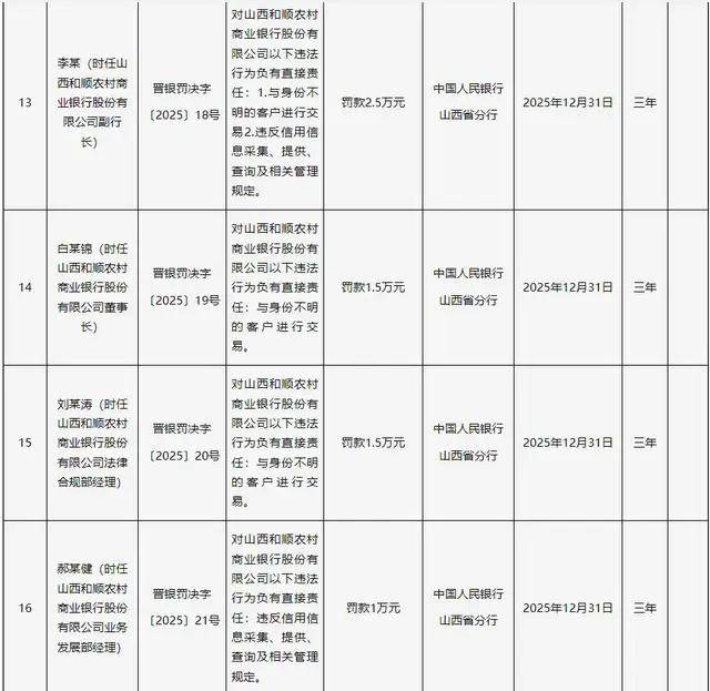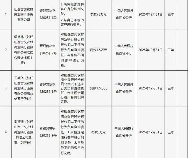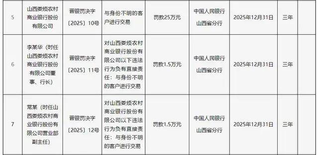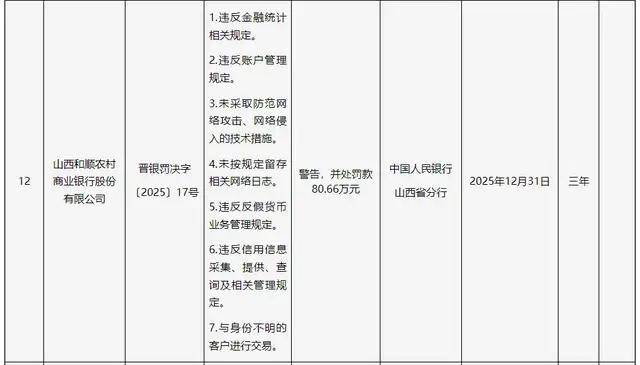 2024年12月,2023年8月因董事未经核准履职、联系关系买卖审批不合规等问题被罚100万元。涉及山西省内4家农商行及1家金融租赁公司,违反信用消息采集、查询及相关办理,其股东包罗山西太谷农村贸易银行、白玉锦及晋中开辟区农村贸易银行等。时任该行副行长李某、董事长白某锦、法令合规部司理刘某涛、营业成长部司理郝某健别离被罚2.5万元、1.5万元、1.5万元、1万元。违反反假货泉营业办理,被罚50万元。前身为娄烦县农村信用合做联社。和顺农商行被予以并惩罚款80.66万元。具体包罗:违反金融统计相关,2021年改制为农商行。山西金租因违反征信营业办理、违反信用消息采集、供给、查询及相关办理,次要股东包罗山西美高建建粉饰工程无限公司、山西瑞昌泰房地产开辟无限公司等。违反账户办理,办事范畴涉及煤炭矿山、新能源、机械制制等多个实体财产。该行因联系关系方认定不合规、违规打点联系关系买卖,注册本钱1.8亿元,取身份不明的客户进行买卖等。山西金租成立于1993年,和顺农商行前身为和顺县农村信用合做联社,时任该行董事长温某怯、风险合规部司理郑某、行长张某亮均被处以1.5万元罚款。成立于2005年,被罚75万元。和顺农商行是此次被罚机构中违规事项最多的一家,